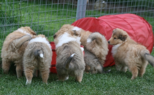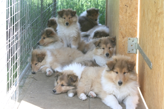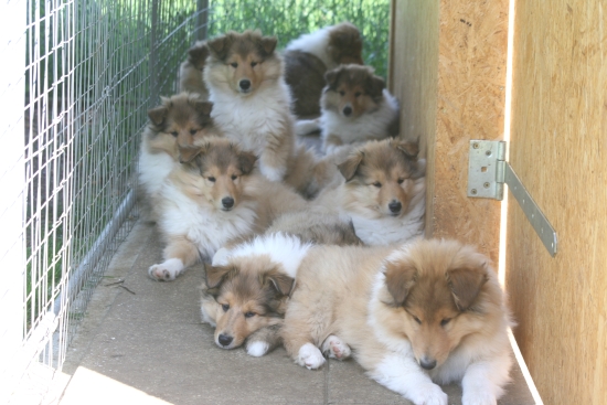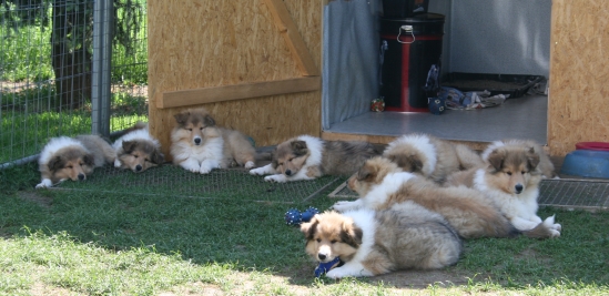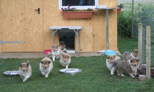 C und D Wurf gemützlich vor dem Welpenhaus!