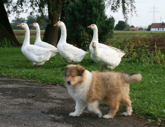 im Alter von 8 Wochen und er zeigt keine Angst vor den großen Gänsen